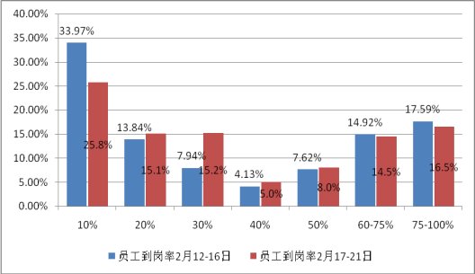 另外,員工返工和企業用工風險并存,也影響到企業復工復產。根據調查,企業員工到崗率由調查開始(2月12-16日)的34.5%回升到調查結束(2月17-21日)的35%,一周僅回升0.5個百分點。物流是勞動密集型產業,用工需求大,員工返崗不能及時到位,企業復工復產將受到嚴重影響。一些勞務輸入地區,片面重視“外防輸入”,謹慎“全面開工”,反復要求壓實企業責任,一旦有疫情發生,企業將面臨停工甚至破產的重大后果。很多企業開工謹慎,部分企業甚至表示寧愿不開工也不愿意冒風險。
