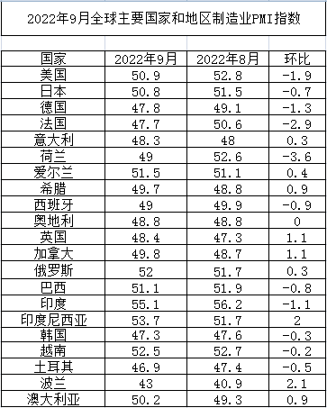 2022年9月全球主要國(guó)家制造業(yè)PMI