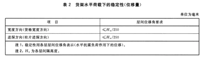 規(guī)定了輕型穿梭式貨架各主要部位在垂直荷載下的強度、剛度(變形量)、水平荷載下的穩(wěn)定性(位移量)要求。主要參考了歐洲標準FEM 10.2.02《托盤式貨架設(shè)計規(guī)范》、FEM 10.2.06《擱板式貨架設(shè)計規(guī)范》和我國標準WB/T 1116-2021《閣樓式貨架》中的相關(guān)指標,同時也結(jié)合了試驗驗證結(jié)果綜合給出。