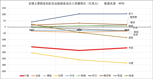 在運輸服務項下,海運是運輸服務貿易逆差的最主要來源,占到64.8%,其次是空運,占到27.9%。2019年我國航空運輸服務進出口逆差額為163.85億美元,差額遠大于美國和日本,而德國、韓國、俄羅斯、荷蘭則保持順差態勢。