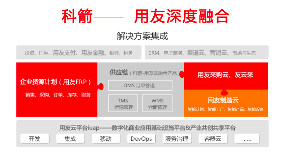 在短短的半年時間,科箭與用友不僅在產品融合上落地,更以融合一體化方式共同服務企業客戶。如今年共同為云南建投打造物流中臺,即在用友營銷中臺的基礎上,為企業提供科箭-用友云融合產品的物流中臺,包括TMS/WMS/OMS云,幫助企業實現一體化、中臺化的管理。