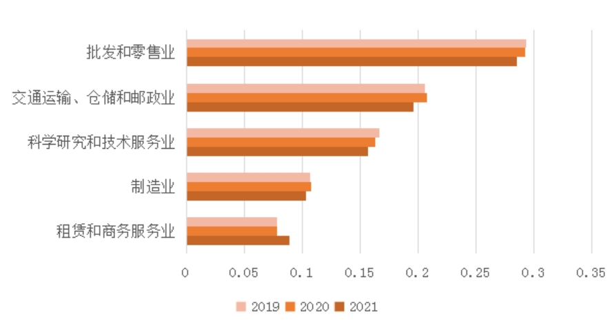 《報告》通過京東企業(yè)購大數據發(fā)現,服務行業(yè)中小企業(yè)的采購數字化水平相較其他行業(yè)更高。從成交金額看,批發(fā)和零售業(yè)、科學研究和技術服務業(yè)、交通運輸、倉儲和郵政、制造業(yè)以及租賃和商務服務業(yè)是線上采購金額最多的五大行業(yè)。其中,批發(fā)和零售業(yè)的成交金額占到了總成交金額的約30%。與活躍用戶數占比情況類似,主要行業(yè)的中小企業(yè)的成交額占比整體較為穩(wěn)定。