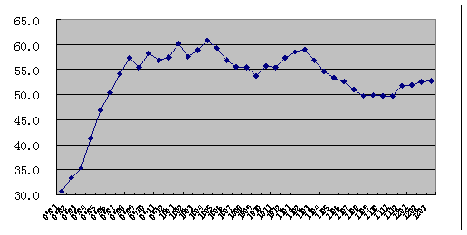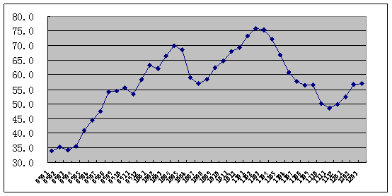 購進價格指數高位攀升。3月份,購進價格指數繼續上行,達到57.0%,比上月上升0.3個百分點。雖然該指數同2011年一季度相比仍屬溫和,但已觸及最近8個月以來的高點,顯示出通脹壓力上升。從受調查的國家來看,幾乎呈全部上升之勢。